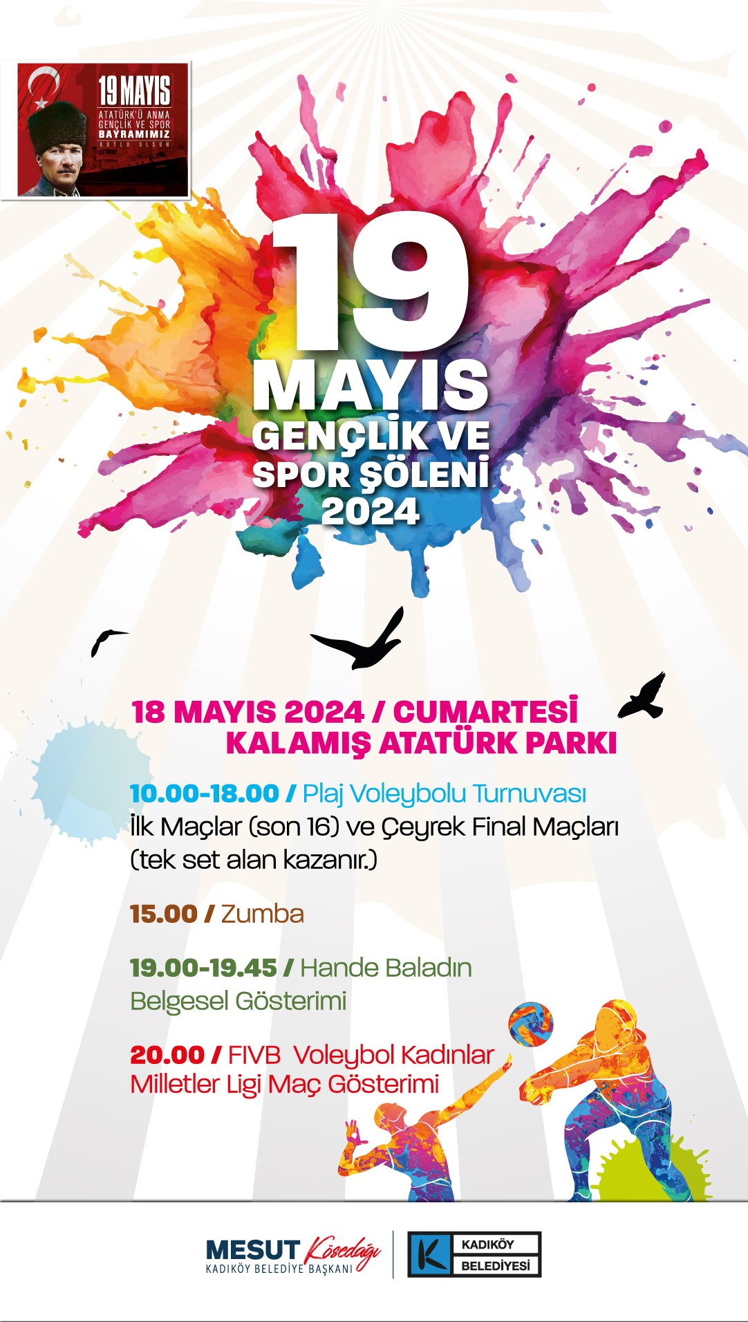 Kadıköy’de 19 Mayıs Atatürk’ü Anma, Gençlik ve Spor Bayramı kutlamaları, 18 Mayıs Cumartesi günü Kalamış Atatürk Parkı’nda gerçekleştirilecek kadınlar ve erkekler Plaj Voleybolu Turnuvası maçları ile başlayacak. Cumartesi saat 19.00’da ise kadın voleybol milli takımımızın başarılı oyuncularından Hande Baladın’ın hayatını anlatan Baladın isimli belgeselin gösterimi yapılacak. Saat 20.00’de ise Filenin Sultanları’nın FIVB Voleybol Kadınlar Milletler Ligi’nde İtalya ile karşılaşacağı maç, Kalamış Atatürk Parkı’na kurulan dev ekrandan takip edilecek. Ayrıca parkta gün boyu çeşitli dans ve spor gösterileri de gerçekleştirilecek.