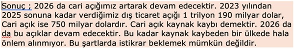 Dahası 2026 da Euro bölgesinde büyüme düşük, yüzde 1,1 seviyesinde bekleniyor. Bu oran 2026 küresel büyüme ve gelişmekte olan ülkeler büyüme oranından daha düşüktür. Türkiye ihracatının yarısına yakınını AB ‘ye yapıyor. AB’ de talep düşük kalacak ve ihracatımızda kısmen daralma olacaktır.