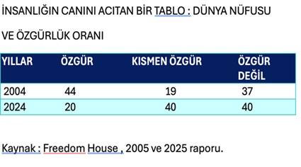 - 2004 yılında özgürlük içinde yaşayan Dünya nüfusunun oranı yüzde 44 iken, 2024’te yüzde 20’ye geriledi.