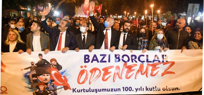 Resepsiyonun ardından Adana Büyükşehir Belediyesi önünden Uğur Mumcu Meydanı’na kadar meşaleli yürüyüş yapıldı. “Bazı borçlar ödenemez” yazılı pankart taşıyan kortej, Uğur Mumcu Meydanı’na kadar coşkuyla yürüdü.