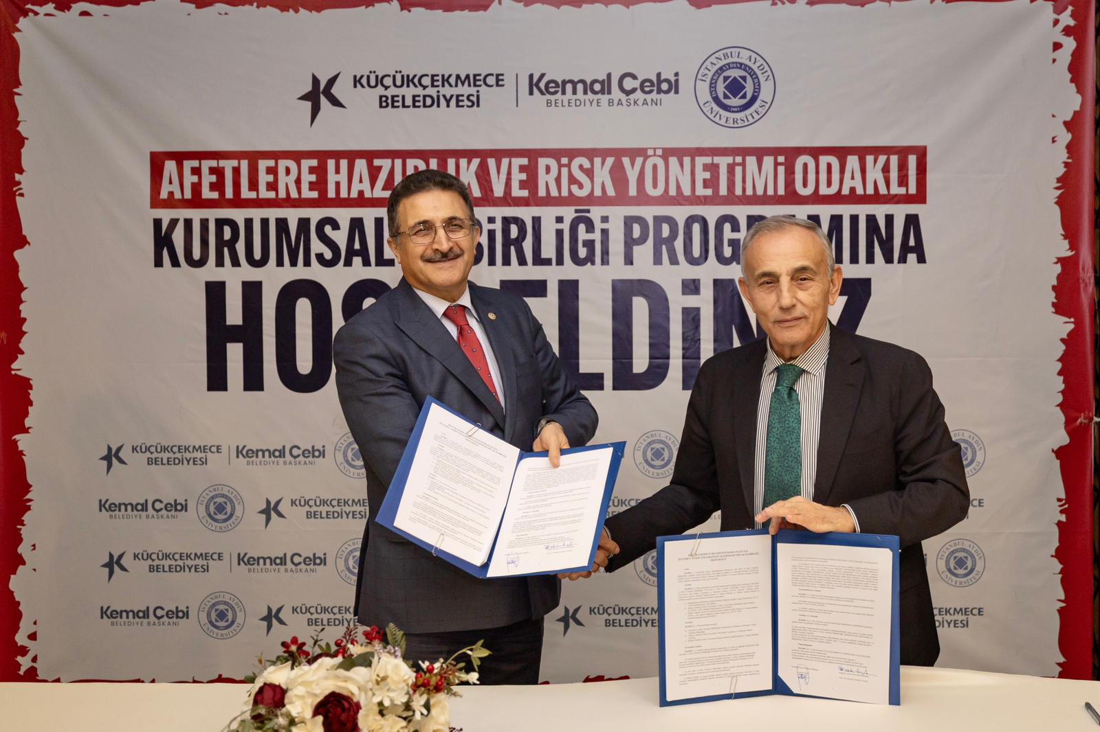 Küçükçekmece Belediyesi’nin ev sahipliğinde Afetlere Hazırlık ve Risk Yönetimi Odaklı Kurumsal İş Birliği programı düzenlendi. Belediye Binasında düzenlenen programın sonunda Küçükçekmece Belediye Başkanı Kemal Çebi ve İstanbul Aydın Üniversitesi Rektörü Prof. Dr. İbrahim Hakkı Aydın, ‘Afetlere Hazırlık ve Risk Yönetimi Odaklı Kurumsal İş Birliği’ Protokolünü imzaladı.