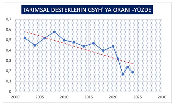 Türkiye de 2024 bütçesinden fiilen ödenen Tarımsal desteklerin GSYH’ ya oranı yüzde 0,19’dur. (Aşağıdaki tablo ve Grafik)