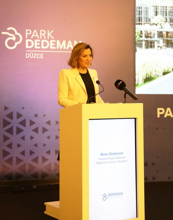 Düzce’nin tarihi ve coğrafi güzelliklerinin anlatıldığı tanıtım filmlerinin gösterimiyle başlayan törende ilk olarak Dedeman Hotels & Resorts International Yönetim Kurulu Başkanı Banu Dedeman söz aldı. Dedeman markası olarak, kurulduğumuz günden bugüne kadar, tam 55 yıldır, gerçekleştirdiğimiz yatırımlar ve işlettiğimiz oteller ile ülkemiz için ekonomik değer ve istihdam yaratmayı hedefledik diyen Banu Dedeman, “Türkiye’de saklı kalmış turizm değerlerini açığa çıkarma, bu değerleri ülke ekonomisine kazandırma ve tanıtma misyonumuzu Park Dedeman Düzce ile bir kez daha gerçekleştirecek olmanın heyecanını ve memnuniyetini yaşıyoruz. Türkiye’nin ilk uluslararası otel zinciri olarak hali hazırda 18 otelimiz, 2800 oda, 5700 yatak kapasitesi ve 1000’i aşkın çalışanımızla, bulunduğumuz her bölgede turizmin gelişmesine destek olduk. Sahip olduğumuz tecrübe ve bilgi birikimi, yetişmiş ve başarılı kadromuz, sürdürülebilir stratejimiz ile tüm dünyayı etkileyen pandemi döneminde de uzun vadeli hedeflerimizde bir değişiklik yapmadan büyümeye devam etmenin gurur ve mutluluğu içerisindeyiz” diyerek sözlerine devam etti.