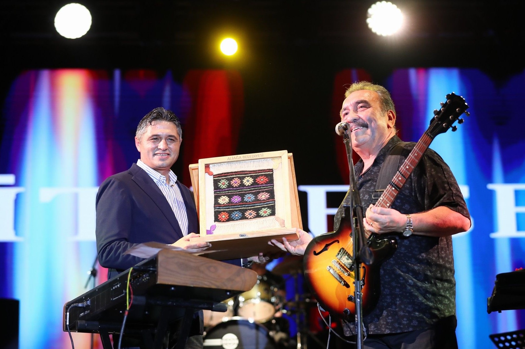 Aliağa Belediye Başkanı Serkan Acar, Aliağalı müzikseverlere unutulmaz bir gece yaşatan sanatçılara Aliağa Sanat Günleri’ne katılımlarından dolayı tek tek teşekkür ederek, kendilerine Aliağalı üretici kadınlar tarafından el emeği ile üretilen, Aliağa yöresine özgü, tarihi Helvacı Kilimi hediye etti.