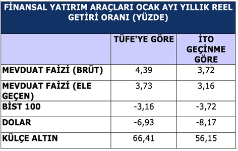TÜİK verilerine göre ocak ayında son bir yılda tasarruflarını altına yatırınlar, enflasyondan sonra yani yüzde 66,41 oranında reel getiri elde ettiler.