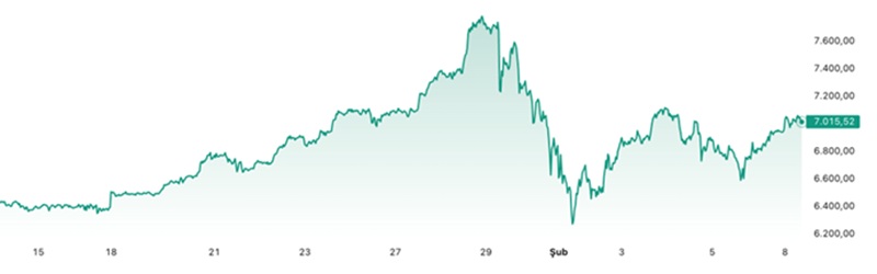 Aşağıdaki grafik, son 20 günde gram altın fiyatlarındaki hareketleri gösteriyor. Altın fiyatlarında aşırı kırılganlık var. 28 Ocak 2026 günü 7 740 liraya çıkan gram altın fiyatı dün öğlen vakti, 7 022 lira idi. (Aşağıdaki Grafik)