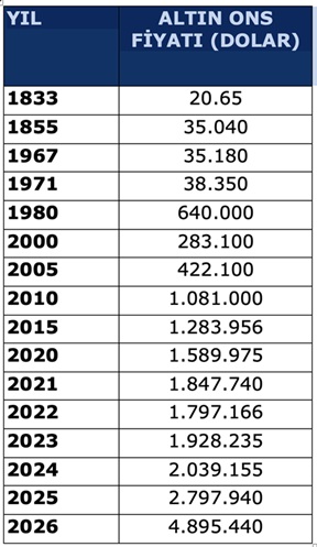 Altının ons fiyatı, 1833 yılında 20,65 dolardı, 1855 yılı ile 1967 yılı arasında yaklaşık 35 dolarda kaldı. 1944 Bretton Woods‘ta bir dolar 35 ons altın olarak kabul edildi ve dolar altına bağlandı. Altın standardına geçildi. Ancak 1967 ve 1971 petrol krizlerinden sonra bu sistem kaldırıldı. 2000 yılında 283,1 dolar olan bir ons altın ocak ortalaması 4.895,440 dolar ve dün de 5028 dolardı.