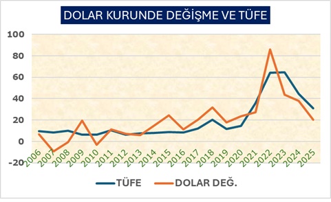 Türkiye’de ise 2023 ortalarından beri sıcak para girişi ve MB uygulamaları ve aynı zamanda MB ve kamu bankalarının dolar satısı nedeni ile Dolar kurunda artış TÜFE’nin altında kaldı.