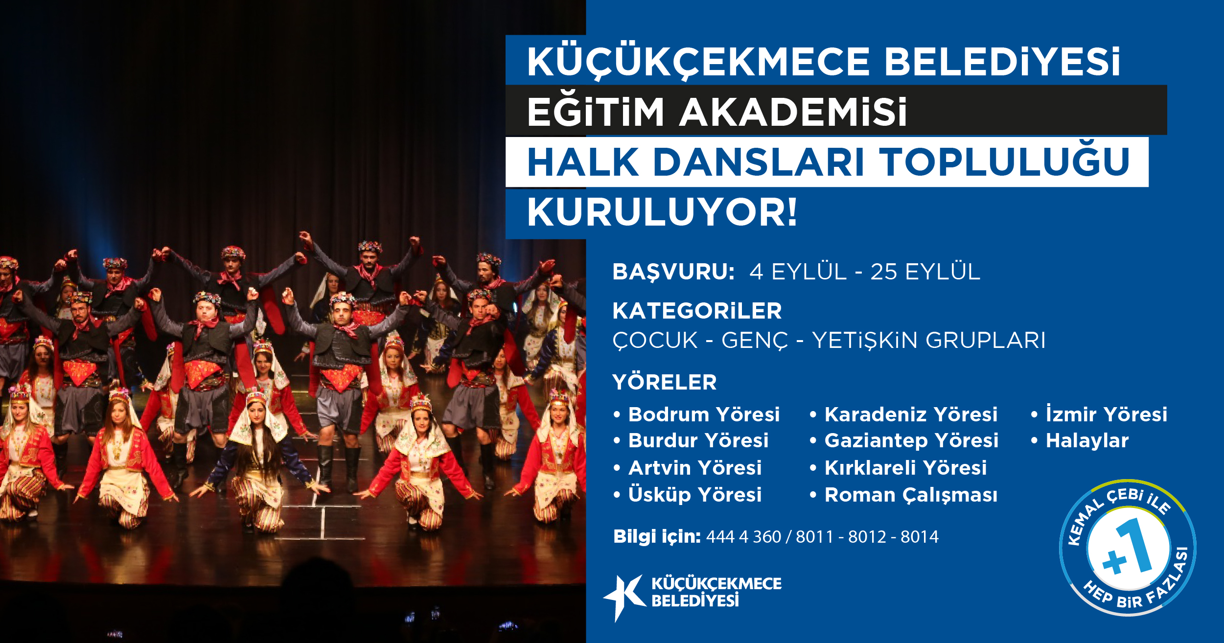 Son başvuru tarihi 25 Eylül olan kurslara başvuru için ise şartlar şu şekilde; belirlenen yaş aralığında olmak ve Küçükçekmece’de ikamet etmek. Ön kayıtların sonrasında ise eğitmenlerden oluşan kurul tarafından seçmeler yapılacak. Çocuk (8-14 yaş), Genç (15-25 yaş) ve Yetişkin (26 ve üzeri yaşlar) olmak üzere 3 kategoride oluşturulan sınıflarda, Kırklareli, İzmir, Gaziantep, Karadeniz, Artvin, Bodrum, Üsküp, Burdur Yöreleri ile Roman Çalışması ve halay eğitimleri verilecek. Uzman eğitmenler tarafından verilecek kurslara katılmak ve bilgi almak isteyenler 444 4 360’nolu telefonu arayabilir.
