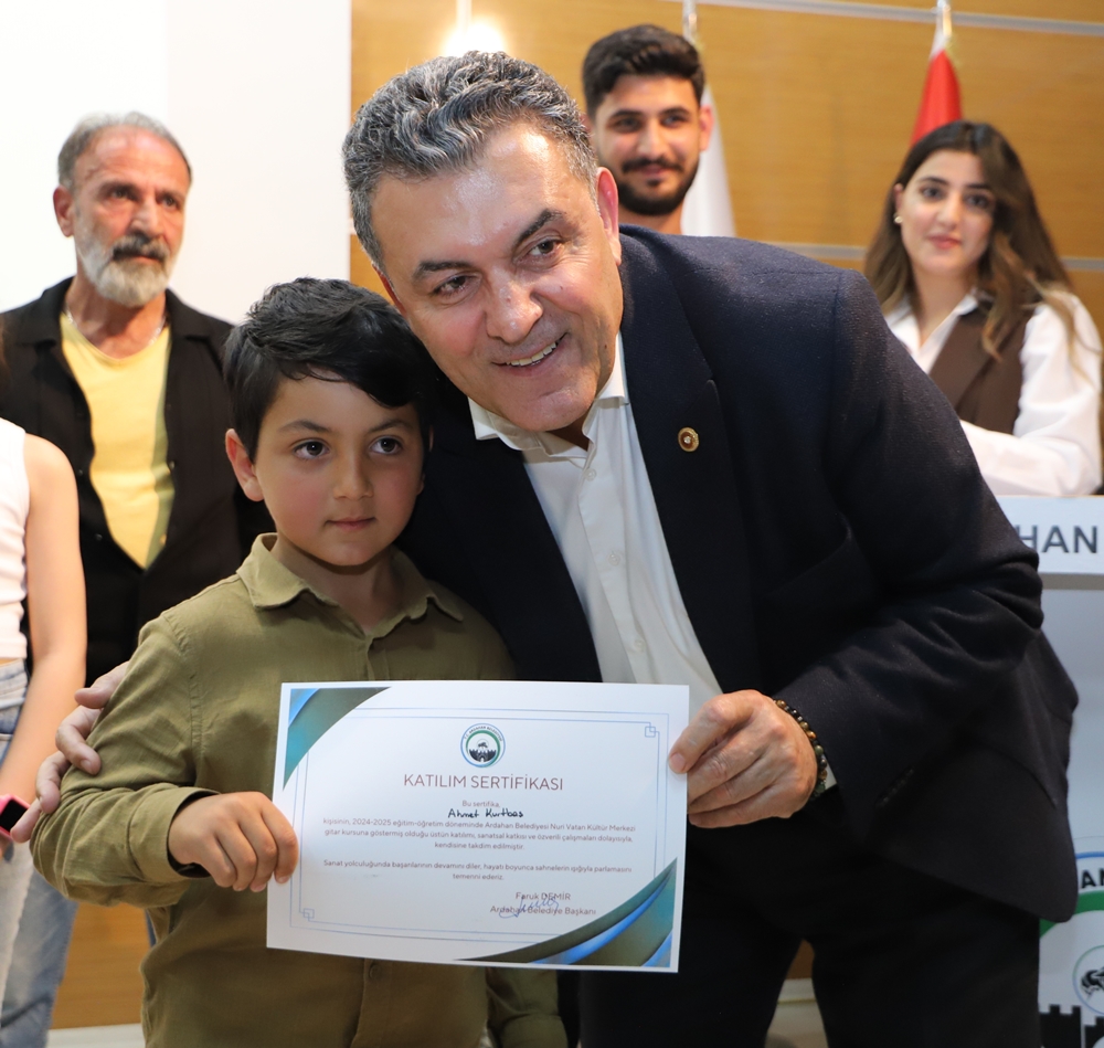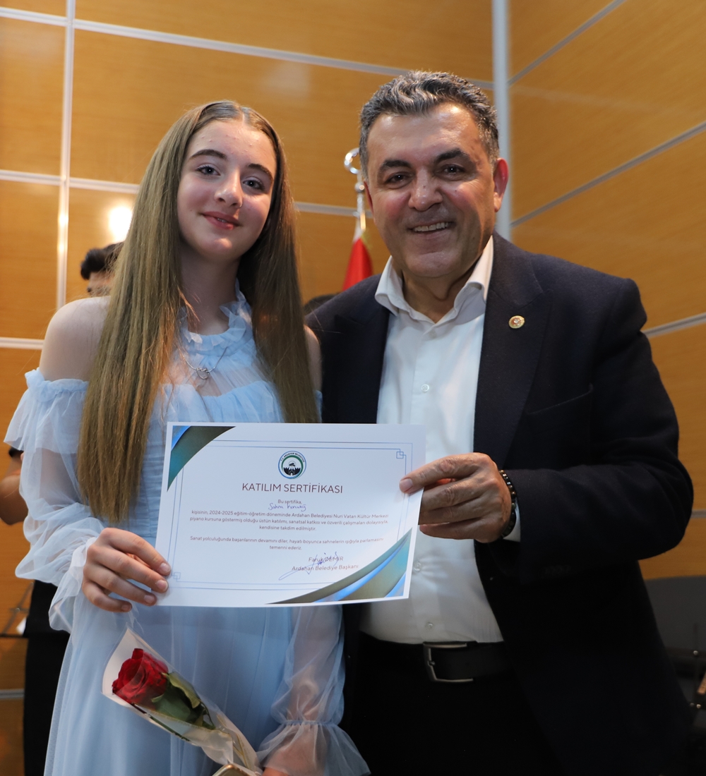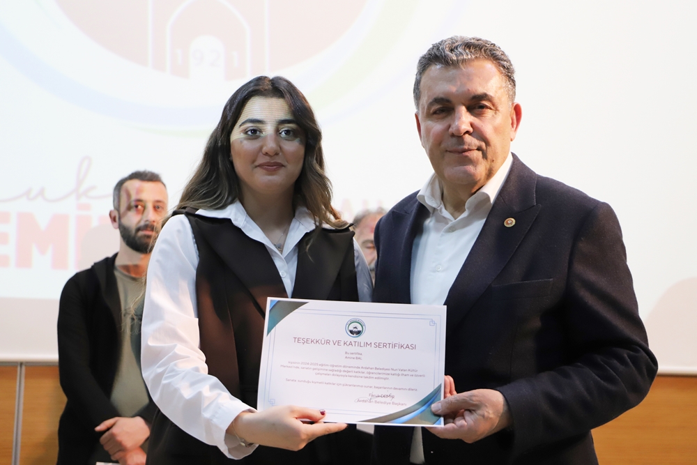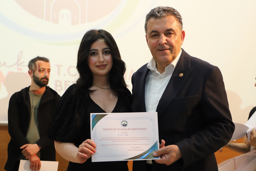 Ardahan’da ilk defa Belediye Başkanı Faruk Demir’in inşa ederek faaliyete koyduğu Nuri Vatan Kültür Merkezi’nde neredeyse tüm sanat dallarında yüzlerce kursiyere eğitim veriliyor. Bu kapsamda Kültür Merkezi’nde 2004-2005 eğitim döneminde verilen emek ve ortaya konulan çabaların vatandaşlarla paylaşılması için 2 gün boyunca yapılan etkinlikte eğitmen ve kursiyerler, sahnede gösterdikleri performanslarla gönülleri fethettiler. Program bitiminde Belediye Başkanı Faruk Demir ile eşi Zuhal Demir, Nuri Vatan Kültür Merkezi eğitmen ve kursiyerlerine teşekkür ederek sertifikalarını verdiler.