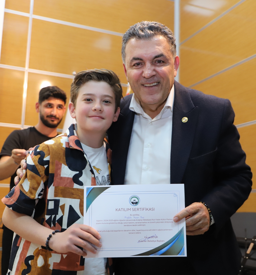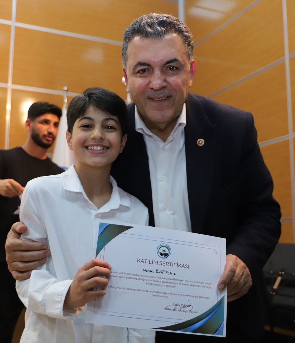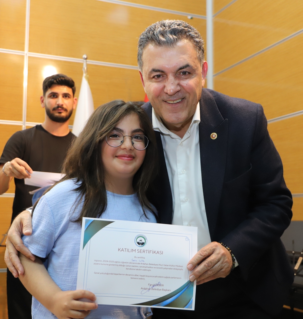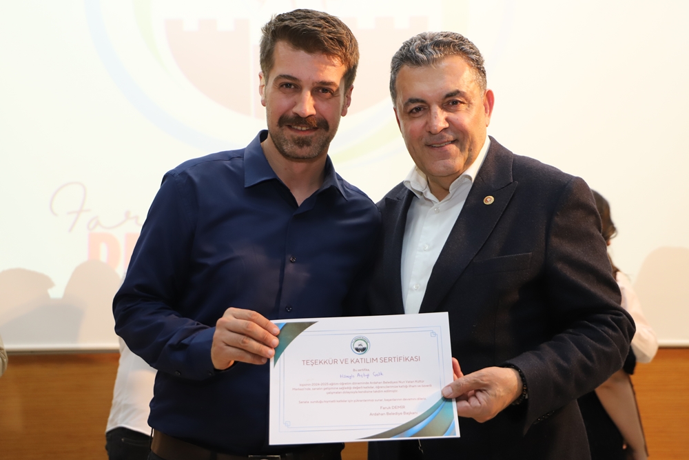 Ardahan’da ilk defa Belediye Başkanı Faruk Demir’in inşa ederek faaliyete koyduğu Nuri Vatan Kültür Merkezi’nde neredeyse tüm sanat dallarında yüzlerce kursiyere eğitim veriliyor. Bu kapsamda Kültür Merkezi’nde 2004-2005 eğitim döneminde verilen emek ve ortaya konulan çabaların vatandaşlarla paylaşılması için 2 gün boyunca yapılan etkinlikte eğitmen ve kursiyerler, sahnede gösterdikleri performanslarla gönülleri fethettiler. Program bitiminde Belediye Başkanı Faruk Demir ile eşi Zuhal Demir, Nuri Vatan Kültür Merkezi eğitmen ve kursiyerlerine teşekkür ederek sertifikalarını verdiler.