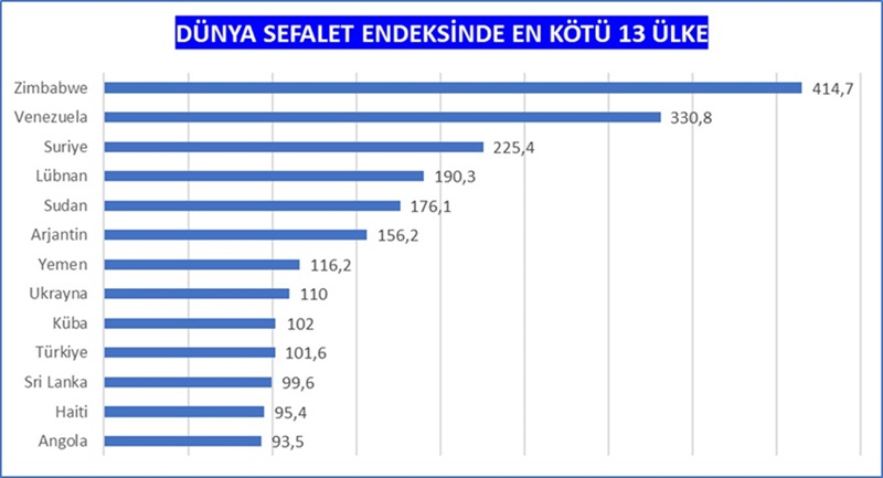 Steve Hanke‘nin yöntemi ile her yıl, İşsizlik, Enflasyon, Uzun dönemli faiz oranı ile Fert başına gelirin kriter olarak kullanıldığı bir ‘’ Dünya Sefalet Endeksi ‘’hazırlanıyor Yüksek enflasyon, işsizlik ve uzun dönemli faiz oranları, 2022 yılında Türkiye’yi Dünya sefalet Endeksinde, Dünyanın en sefil 10 sırada ülkesi yaptı.