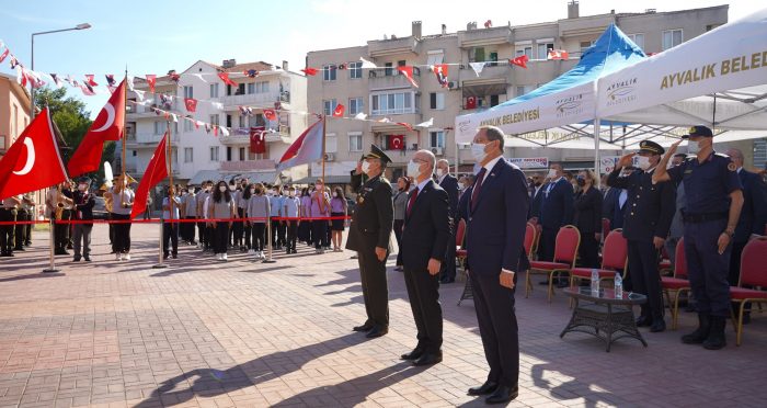 Kaymakamlık, Garnizon Komutanlığı ve Belediye Başkanlığı çelenklerinin sunumuyla başlayan tören, 1 dakikalık saygı duruşu ve ardından askeri bando eşliğinde İstiklal Marşının okunmasıyla devam etti. Öğrencilerin şiirlerle, halk oyunlarıyla katıldığı, trap atış yarışlarının ödüllerinin de dağıtıldığı törende konuşan Ayvalık Belediye Başkanı Mesut Ergin şunları söyledi: