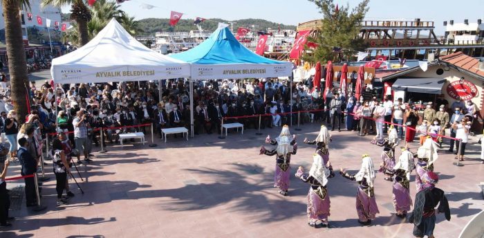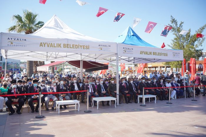 Sabah saatlerinde top atışıyla başlayan törene; AK Parti Balıkesir Milletvekili Yavuş Subaşı, Ayvalık Kaymakamı Hasan Yaman, Ayvalık Garnizon Komutanı Albay Ertan Tutar, Ayvalık Belediye Başkanı Mesut Ergin, Ayvalık İlçe Jandarma Komutanı Yüzbaşı Onur Yakan, Ayvalık İlçe Emniyet Müdürü Turgut Coşkun, belediye başkan yardımcıları, siyasi parti temsilcileri, belediye meclis üyeleri, mahalle muhtarları, daire amirleri, gaziler ve Ayvalıklı vatandaşlar katıldı. Çelenk sunumuyla başlayan tören bir dakikalık saygı duruşu ve ardından Askeri Bando tarafından İstiklal Marşı’nın okunmasıyla devam etti.