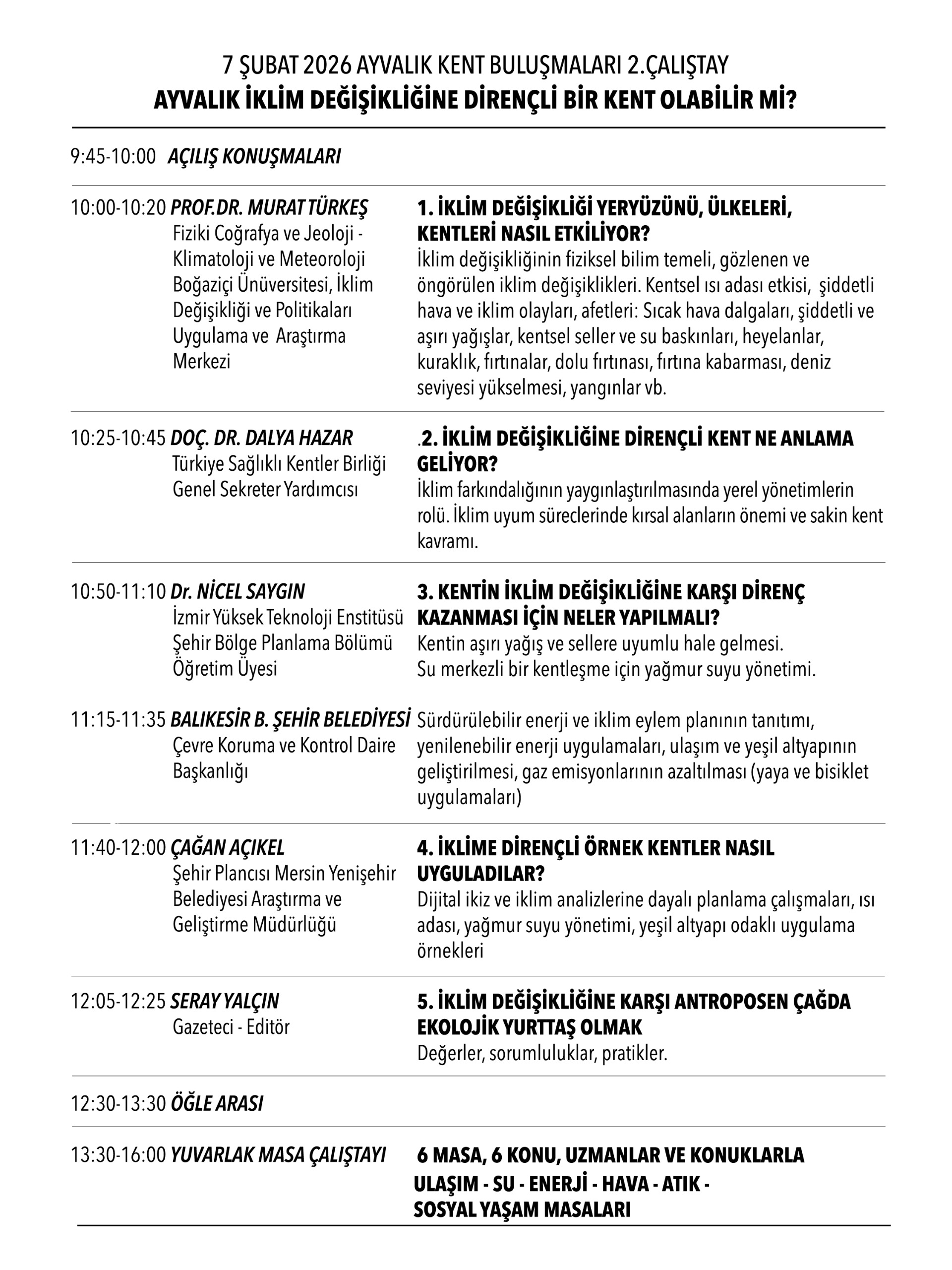 Programın çalıştay bölümünde ise katılımcılar, ulaşım, su yönetimi, enerji, hava kalitesi, atık yönetimi ve sosyal yaşam başlıklarında oluşturulacak masalarda görüş ve önerilerini paylaşacak. Çalıştaylardan elde edilecek çıktılarla Ayvalık’ın sürdürülebilir, yaşanabilir ve insan odaklı bir kent olması yönünde somut öneriler geliştirilmesi hedefleniyor.