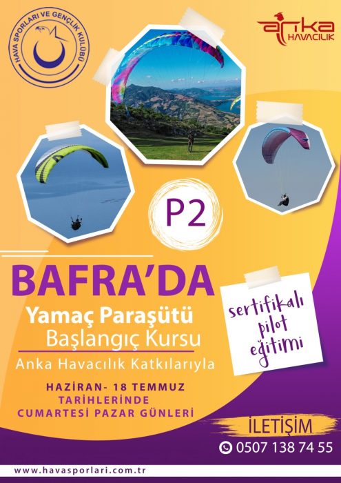 Bafra Hava Sporları ve Gençlik Kulübü ile Ankara’da faaliyet gösteren ANKA havacılık Kulübü işbirliği yaparak Bafra’da Yamaç paraşütü başlangıç(P2) kursu düzenliyor.