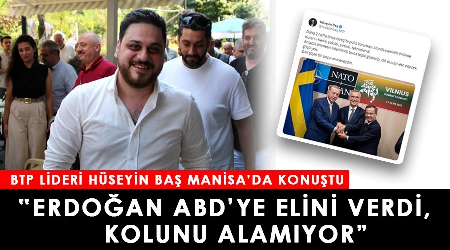 Hep böyle konuşuldu, ama siz o zaman ABD’ye elinizi verdiniz, ondan sonra rahip Brunson’u verdiniz, işte dün İsveç’in NATO üyeliğini kabul ettiniz. Bak kolunu alamıyorsun daha.. ABD’ye elini bir verdin, o iş bitti artık güç onda” dedi. Bağımsız Türkiye Partisi (BTP) Genel Başkanı Hüseyin Baş Manisa, İzmir, Uşak, Afyon, Isparta ve Antalya’yı kapsayan Ege ve Akdeniz turuna çıktı.