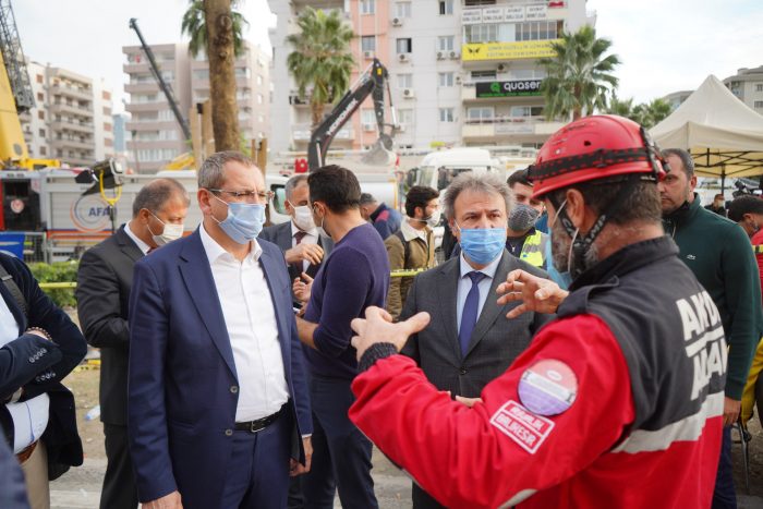 Başkan Ergin deprem bölgesinde ilk günden beri gece gündüz çalışmalara katılan ve çok sayıda insanın kurtarılmasını sağlayan Ayvalık Doğal Afetler Arama Kurtarma ve İlk Yardım Derneği (ADAK) Başkanı Erdinç Tügen’den de çalışmalar hakkında bilgi aldı. Tügen, ekip olarak depremden hemen sonra bölgeye intikal ettiklerini ve Bayraklı’da yıkılan binalarda Cuma gününden beri diğer kurtarma ekipleri ile birlikte koordinasyon halinde çalıştıklarını söyledi.
