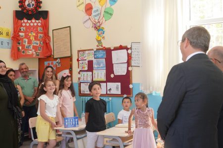 Minik öğrencilere karnelerini dağıtan Kaymakam Hasan Yaman ile Belediye Başkanı Mesut Ergin’in sempatik tavırları öğrencileri mutlu ettiği gözlendi.