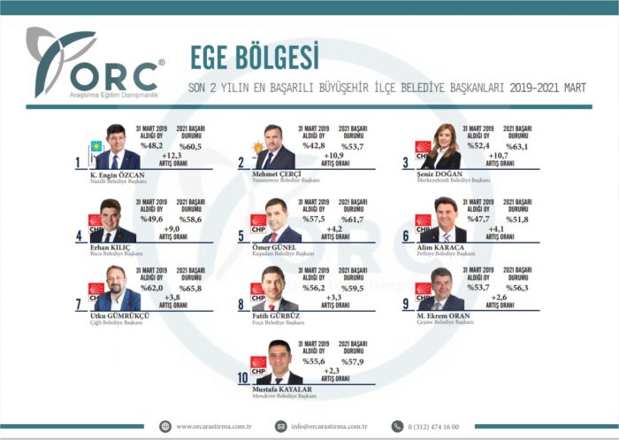 Anket, 19 Mart-7 Nisan tarihleri arasında 30 büyükşehirde, 25 bin seçmenin üzerindeki tüm ilçelerde toplam 27 bin 160 kişi ile yüz yüze ve CATI yöntemiyle gerçekleşti. En başarılı belediye başkanları listesinde, 31 Mart 2019 yerel seçimlerinde almış olduğu oydan daha fazla başarı oranına sahip olan büyükşehir ilçe belediye başkanları yer aldı. Ege Bölgesi sonuçlarına göre Menderes Belediye Başkanı Mustafa Kayalar, yüzde 2,3 artış oranı ile en başarılı belediye başkanları arasında ilk 10’a girdi. Başkan Kayalar, 31 Mart 2019 yerel seçimlerinde aldığı yüzde 55,6’lık oy oranını yüzde 57,9’a çıkarmış oldu.