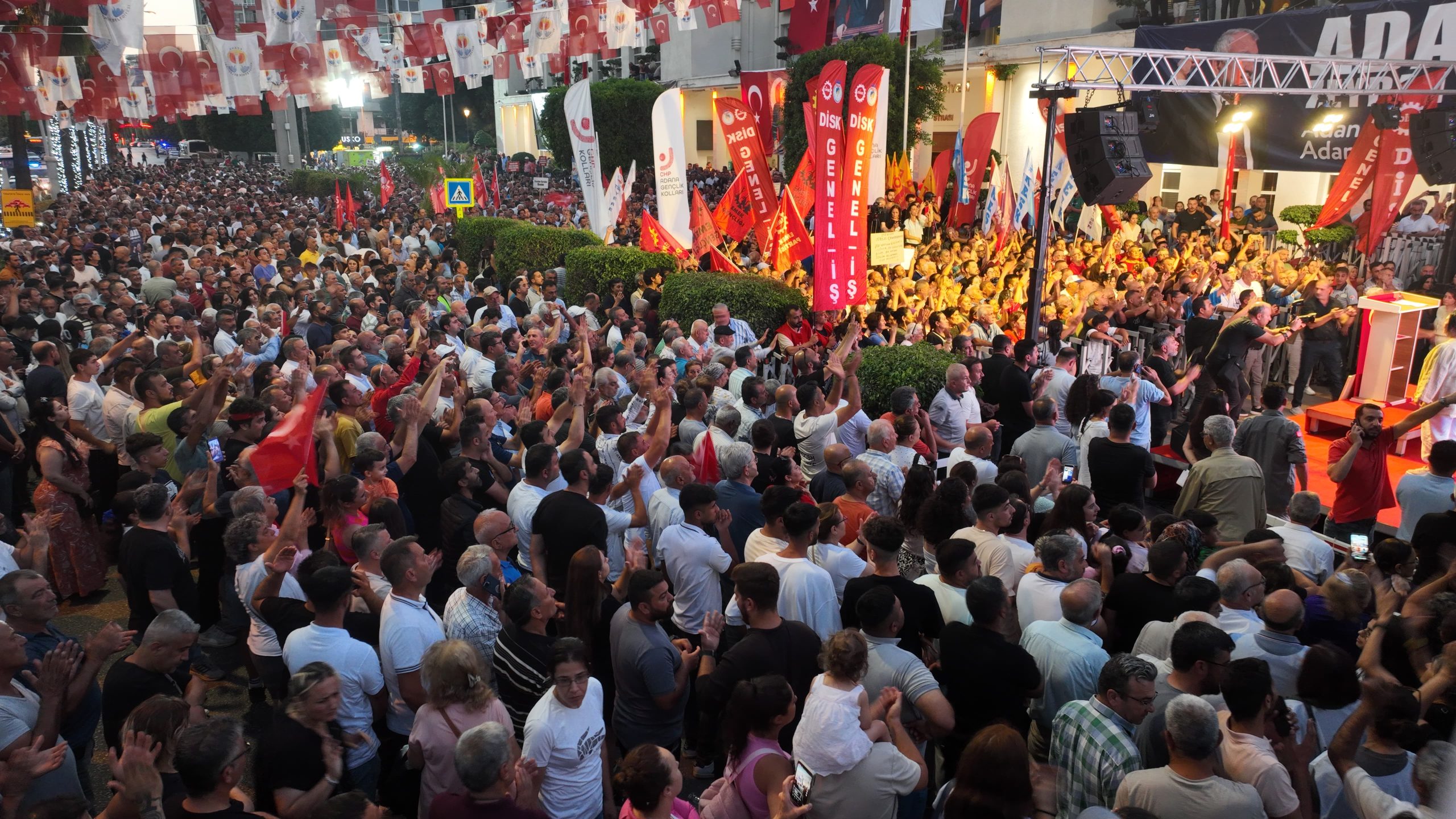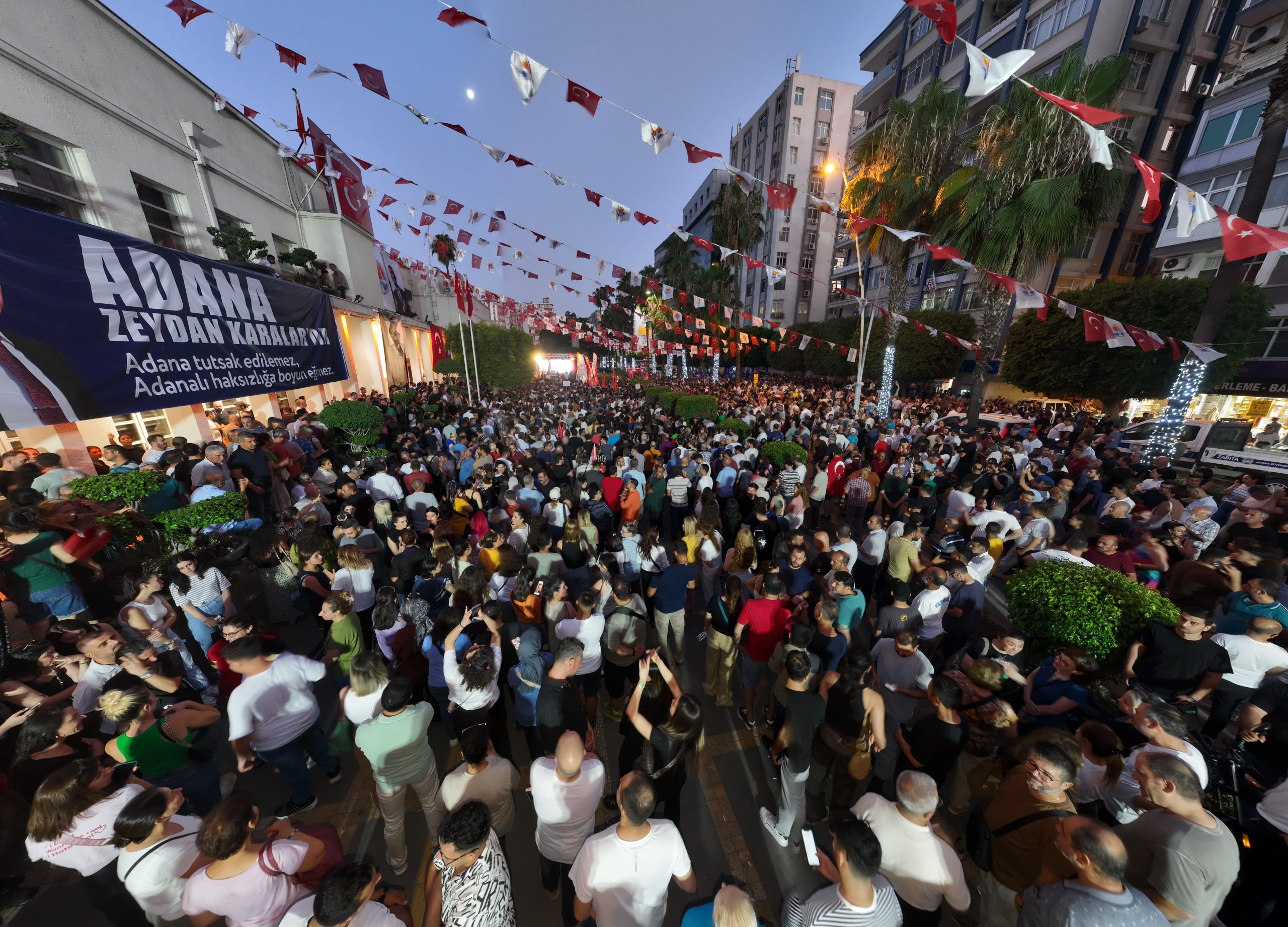 Adana Büyükşehir Belediye Başkanı Zeydan Karalar’a destek olmak için Cumhuriyet Halk Partisi (CHP) Adana İl Başkanlığı tarafından Adana Büyükşehir Belediyesi önünde miting düzenlendi. Alana gelen binlerce vatandaş, meydanı tamamen doldurdu. Kalabalık nedeniyle Atatürk Caddesi trafiğe kapatıldı.