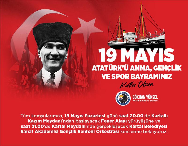 Kartal Belediye Başkanı Gökhan Yüksel, 19 Mayıs Atatürk’ü Anma, Gençlik ve Spor Bayramı dolayısıyla bir kutlama mesajı yayımladı. Mesajında “19 Mayıs; bağımsızlık mücadelesinin meşalesidir, gençliğe duyulan sonsuz güvenin ifadesidir,” diyerek, Türkiye’nin aydınlık geleceğinin gençlerle yükseleceğine vurgu yapan Kartal Belediye Başkanı, şu ifadelere yer verdi: