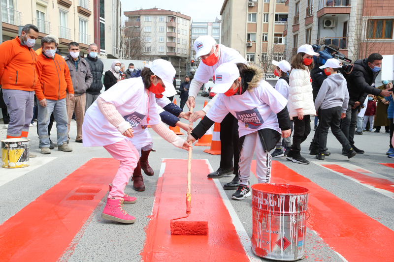 Bayrampaşa Belediye Başkanı Atila Aydıner, ‘Yaya Önceliği Kırmızı Çizgimizdir’ uygulamasına dikkat çekmek ve farkındalık oluşturmak amacıyla ilçedeki yaya geçitlerini çocuklarla birlikte kırmızıya boyadı. Her sürücünün yollarda yayalara yol vermesi gerektiğini hatırlatan Başkan Aydıner, “Sevgili çocuklarımız ile yaya geçitlerini kırmızıya boyadık. Bu vesileyle yaya önceliği konusunda hem çocuklarımızı bilinçlendirdik hem de sürücülere önemli bir mesaj verdik. Unutmayalım, bugün sürücüysek yarın yayayız” dedi.