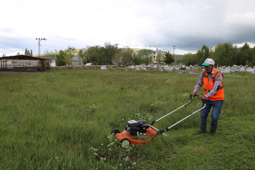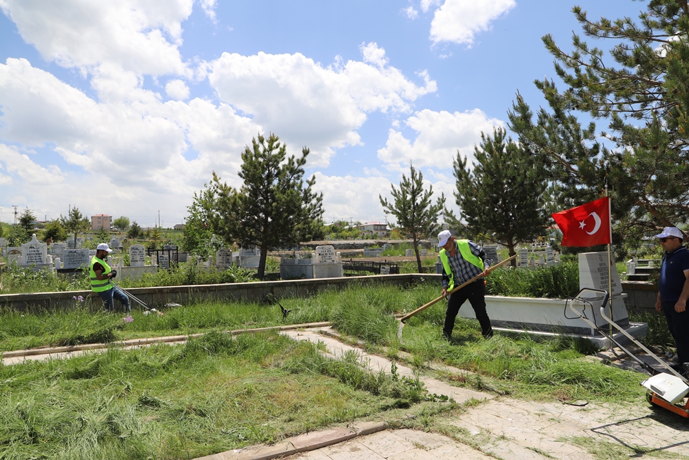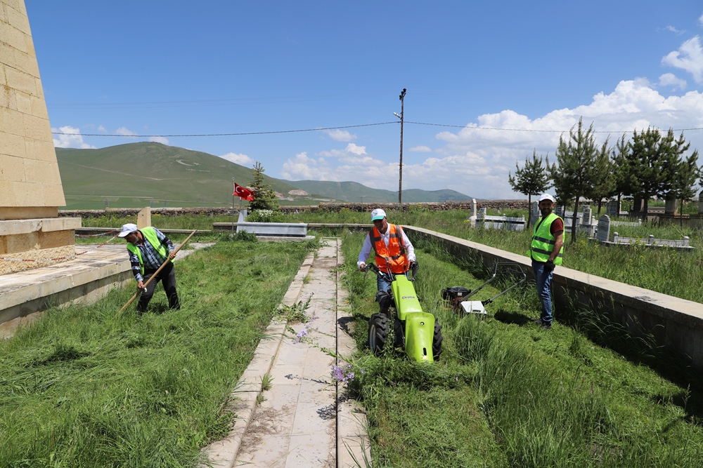 Ekipler, vatandaşların bayramda rahat bir şekilde mezarlıkları ve şehitliği ziyaret edebilmeleri için uzamış olan otları hem iş makineleri hem de tırpan yardımıyla biçerek kötü görüntülerin önüne geçiyor.