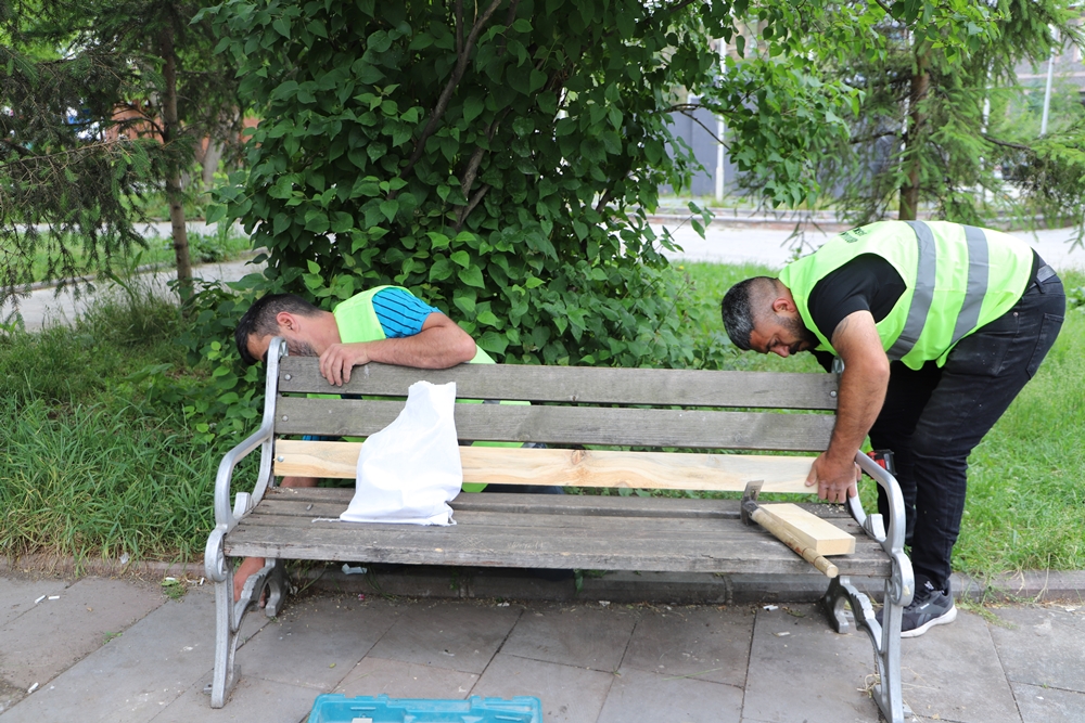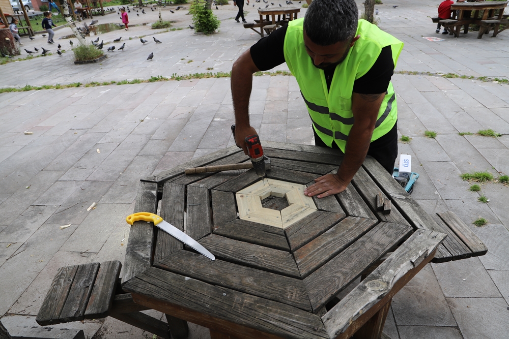 Ekipler, banklar ile yanlarında oturakların da yapıldığı masaları tek tek inceleyerek gerekli bakım ve onarımları yapıyorlar.