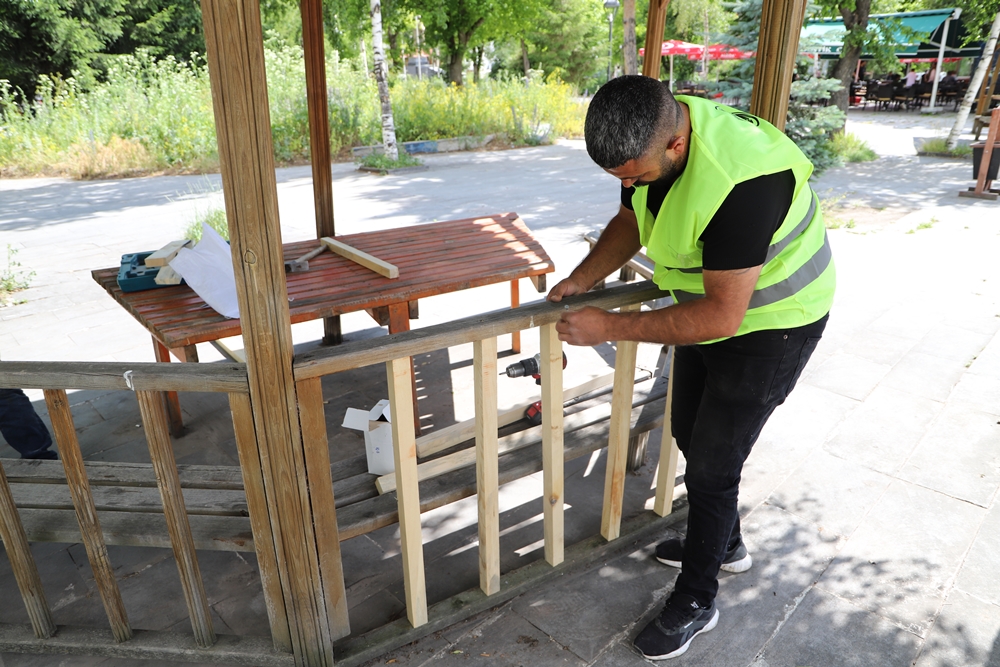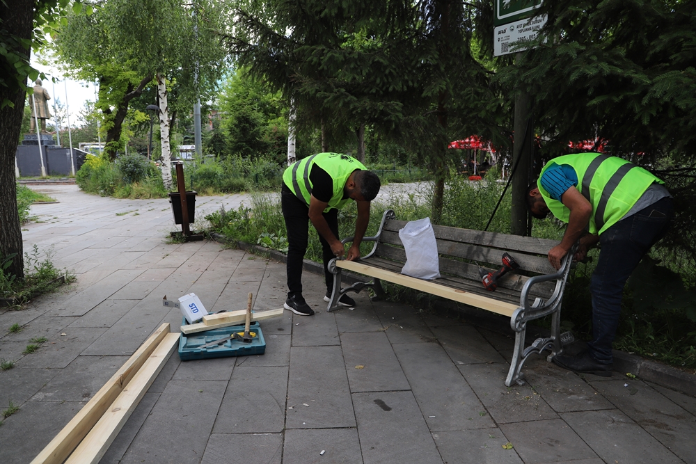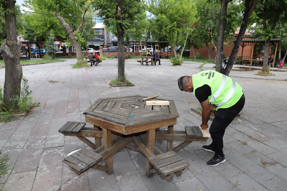 Ekipler, banklar ile yanlarında oturakların da yapıldığı masaları tek tek inceleyerek gerekli bakım ve onarımları yapıyorlar.