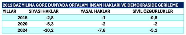 Yine 2012 yılını baz yılı alacak olursak , Dünya ortalaması olarak 2024 yılında siyasi haklar yüzde -10,2 , yasal haklar -7,6 ve sivil özgürlükler -5 oranında geriledi.(Aşağıdaki Tablo )