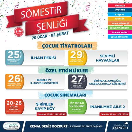 Esenyurt Belediyesi, ilçede yaşayan öğrencilerin yarıyıl tatillerini eğlenceli bir şekilde geçirmeleri için bir dizi etkinlik hazırladı. Tiyatro, sinema ve sömestir şenliği gibi her gün ayrı bir programın yer aldığı etkinlik takviminde, Esenyurtlu minikler hem eğlenecek hem de kültür sanat dolu iki hafta geçirecek. 20 Ocak ve 3 Şubat tarihleri arasında gerçekleştirilecek olan etkinlikler kapsamında sihirbaz gösterileri, ateşbaz, jonglör, kukla çilli, pamuk şeker, palyaço, maskot, yüz boyama, çocuk tiyatro oyunları ve film gösterimleri yer alacak. Sömestir şenliği ile eğlenceye doyacak olan çocuklar, yeni eğitim dönemine de stressiz bir şekilde başlayacak.