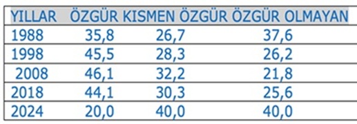 2008 de özgür ülke sayısının toplam ülkelere oranı yüzde 46,1 iken 2024’te yüzde 20’ye geriledi. Özgür olmayan ülkelerin oranı ise yine 2008 de yüzde 21,8 iken, 2024‘te yüzde 40’a yükseldi.
