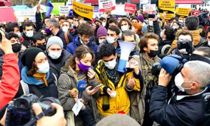 Boğaziçi Üniversitesine atanan kayyum rektör Melih Bulu’yu kabul etmediklerini ve bir sanat eserini sergiye astıkları için tutuklanan Doğu ve Selo’nun yanlarında olduklarını haykırmak için seslerinin binlerce sıra arkadaşlarının sesiyle birleştirdiler.