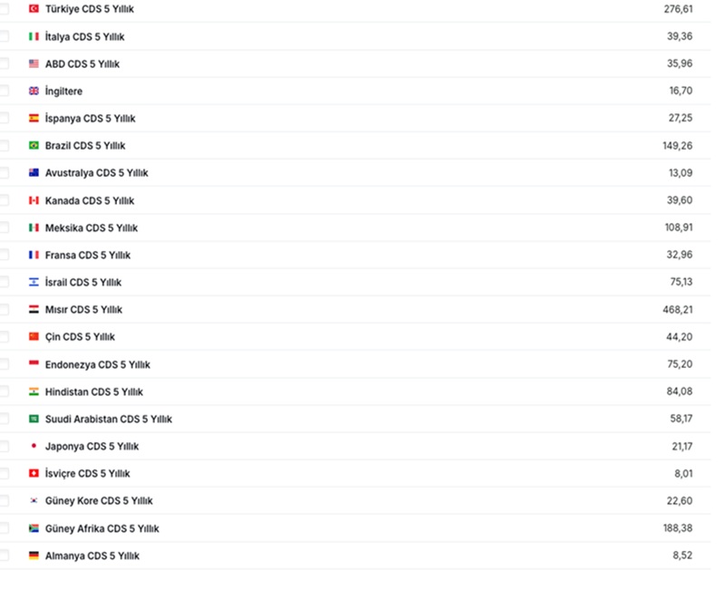 Türkiye’nin kredi notu düşük (BB-/B) ve risk primi (CDS) yüksek ve ekonomi kırılgan olduğundan, yurtdışından borçlanırken diğer ülkelere göre daha yüksek faiz ödemek zorunda kalıyor. Aşağıdaki tabloda son durum olarak, ülkelerin CDS oranları yer alıyor. Risk primi en yüksek ülke Mısır 468 baz puan ve ikinci sırada Türkiye 276,61 geliyor.