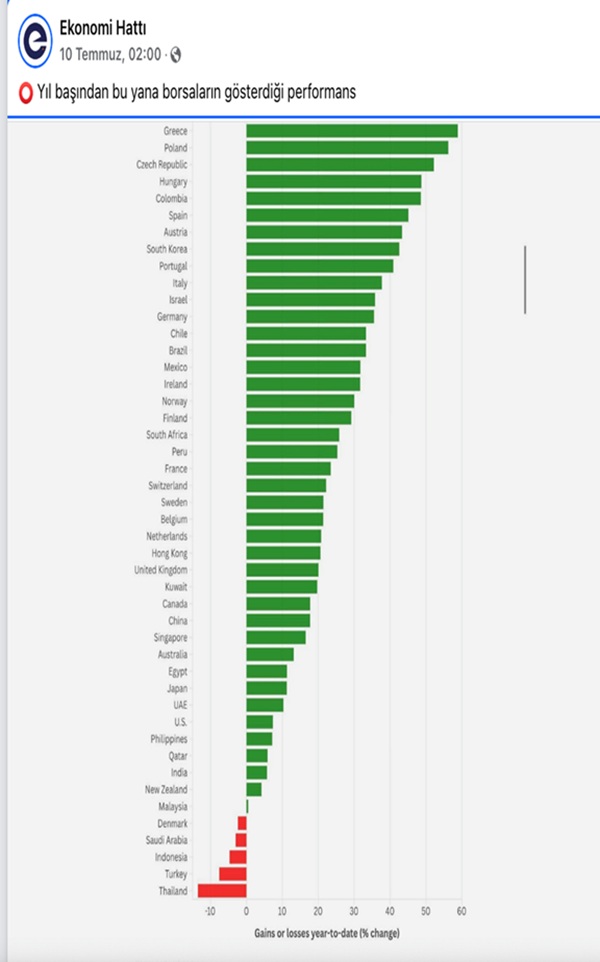 Yılbaşından temmuz ayına kadar dünya borsaları içinde en iyi performansı birinci sırada Yunanistan, ikinci sırada Polonya borsası gösterdi. En kötü performansı ise en son sırada Tayland, sondan ikinci sırada ise Türkiye borsası gösterdi. Aşağıdaki Grafik ekonomi hattı tarafından yayınlandı.