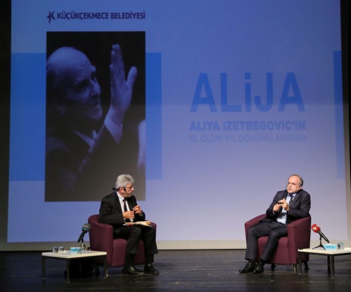 Prof. Dr. Adem Fazlıoğlu ise İzzetbegoviç’in halkı için verdiği mücadeleyi ve sarsılmaz inancından söz ettiği söyleşide, “Aliya İzzetbegoviç uzak görüşlü ve lider bir isimdir. O, ‘Bosna yalnızca bir toprak değil, çok etnikli, çok dinli, çok kültürlü bir toplumun bir arada yaşama fikridir’ demiştir. Bosna’nın Sırp, Hırvat ve Boşnakların bir arada yaşadığı bir vatan olmasını istemiştir. Sırpların ve Hırvatların başka hayalleri olsa da İzzetbegoviç’in siyasetinde ortak vatan vardır. Kendisini minnetle anıyoruz. İstediği bağımsız bütünlüğünü koruyan, özgür Bosna ilelebet yaşasın. Felsefeci, düşünür, cesur, vazgeçmeyen, savaşçı, dindar ama modern Aliya İzzetbegoviç’i anmamıza olanak sağlayan emeği geçen CHP İl Başkanlığı ve Küçükçekmece Belediyesi’ne teşekkür ederim” diye konuştu.