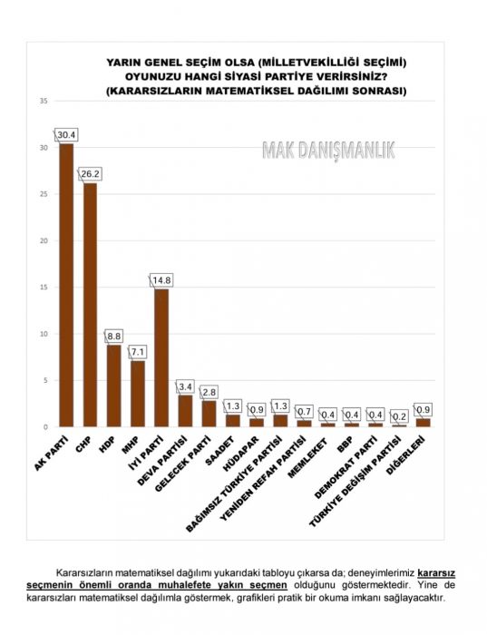 MAK Danışmanlık Yönetim Kurulu Başkanı Mehmet Ali Kulat tarafından aktarılan ankete göre AK Parti yüzde 30.4, CHP yüzde 26.2, İYİ Parti yüzde 14.8, HDP yüzde 8.8, MHP ise yüzde 7.1 olarak görülüyor.