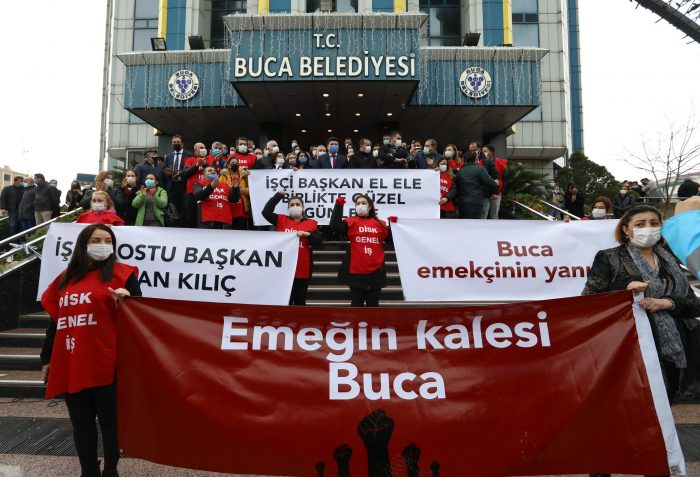 Toplu İş Sözleşmesi’nin bilgilendirme toplantısı Buca Belediyesi Hizmet Binası önünde, bayram havasında gerçekleştirildi. Açıklamaya Buca Belediye Başkanı Av. Erhan Kılıç, DİSK Ege Bölge Temsilcisi Memiş Sarı, CHP Buca İlçe Başkanı Hacer Taş Gültepe, İYİ Parti Buca İlçe Başkanı Gamze Bilgen Torun,  DİSK Genel İş 5 No’lu Şube Başkanı Ali Haydar Kara, Buca Belediyesi Meclis üyeleri ve yüzlerce belediye çalışanları katıldı.   Alana, sahada görevli temizlik ve park işçileri sloganlarla, davul zurnayla girdi.  İşçiler belediye önünde pankartlar açarak “İşçi dostu başkan Erhan Kılıç”, “Buca emeğin yanında”, “Emeğin kalesi Buca”, “İşçi başkan el ele birlikte güzel günlere” sloganları atıldı.  Belediye önünde sosyal mesafe kurallarına dikkat edilerek halaylar çekildi, hep bir ağızdan devrim türküleri söylendi.