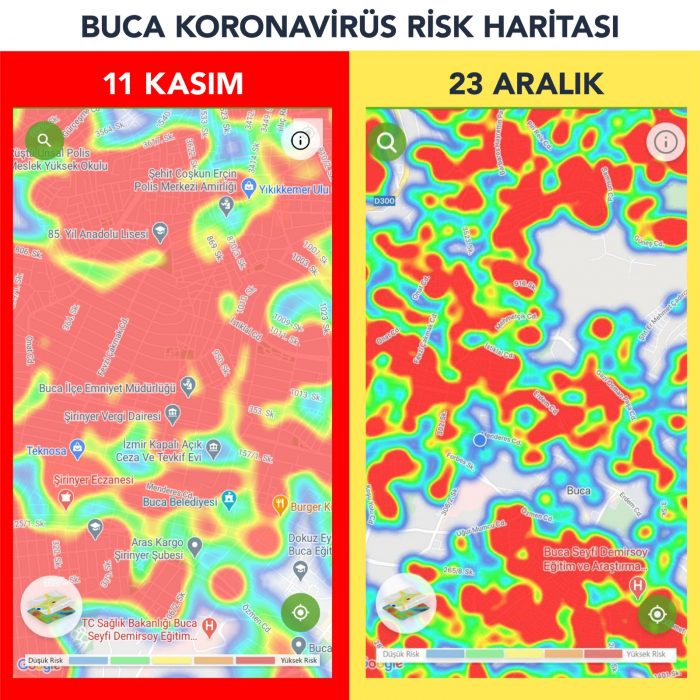 Tedbirlerin en üst düzeyde tutulması için tüm birimlere talimat veren Başkan Kılıç, Hayat Eve Sığar uygulaması üzerinden Buca’nın 11 Kasım 2020 zamanındaki vaka haritasıyla 22 Aralık 2020’deki vaka haritasını paylaştı.
