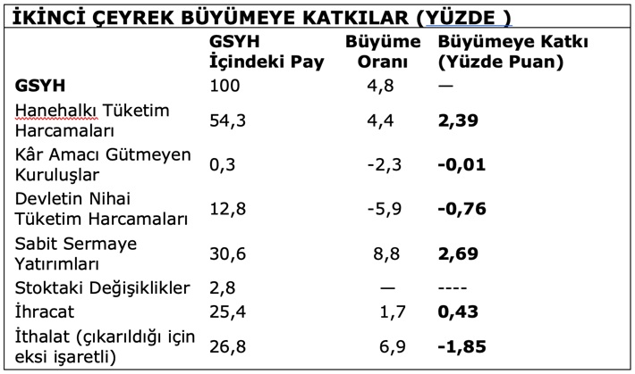 Harcamalar açısından, GSYH’da büyümeye en büyük katkı sabit sermaye yatırımlarından +2,69 yüzdelik puan ve hane halkı tüketiminden 2,39 yüzdelik puan geldi. İhracatın katkısı 043 ve ithalatın katkısı eksi 1,85 oldu. (Aşağıdaki tablo)