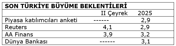 2025 ikinci Çeyrek GSYH’ da büyüme oranı beklentilerin üstünde arttı.  Takvim etkisinden arındırılmış GSYH zincirlenmiş hacim endeksi, 2025 yılı ikinci çeyreğinde bir önceki yılın aynı çeyreğine göre yüzde 4,6 oranında ve bu yılın ilk çeyreğine göre de yüzde 1,6 oranında arttı. İkinci çeyrek en yüksek büyüme beklentisi yüzde 4,1’idi. (Aşağıdaki tablo)