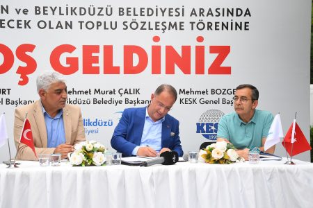 Beylikdüzü Belediyesi ile KESK’e bağlı TÜM BEL-SEN arasında gerçekleşen Toplu İş Sözleşmesinin imza töreni, emekçi personelin katılımı ile Belediye Başkanlık binası bahçesinde gerçekleşti. Törende konuşma yapan Beylikdüzü Belediye Başkanı Mehmet Murat Çalık, Beylikdüzü’nde alın teriyle üretmeye devam ettiklerini vurgulayarak “Şartlar ne olursa olsun sizlerin sosyal ve mali haklarını koruyarak, herhangi bir mağduriyet yaşamanızın önüne geçmek için imkânlarımızı sonuna kadar kullanacağız.” şeklinde konuştu.
