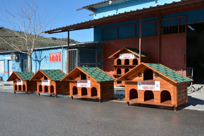 Dikili Belediyesi tarafından sokakta yaşayan kediler için kedi evleri yapılarak ilçenin her noktasına yerleştiriliyor. Mama ve su kapları ile birlikte yerleştirilen kedi evleri daha korunaklı olması için ekstra çam ağacından yapılıyor. Can dostlar için düzenli olarak mama ve su desteği de belediyemiz tarafından karşılanıyor.