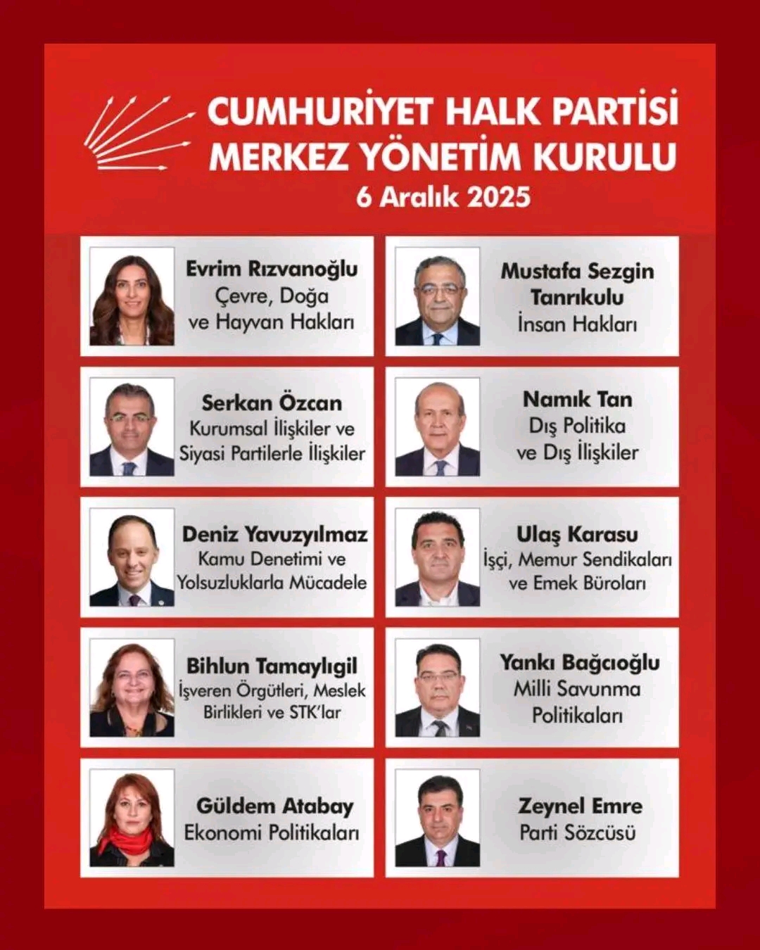 Genel Başkan Özel, MYK’de Serkan Özcan, Evrim Rızvanoğlu, Güldem Atabay, Nurhayat Altaca Kayışoğlu, Bihlun Tamaylıgil, Zeynel Emre ve Sezgin Tanrıkulu olmak üzere 7 yeni isme görev verdi.
