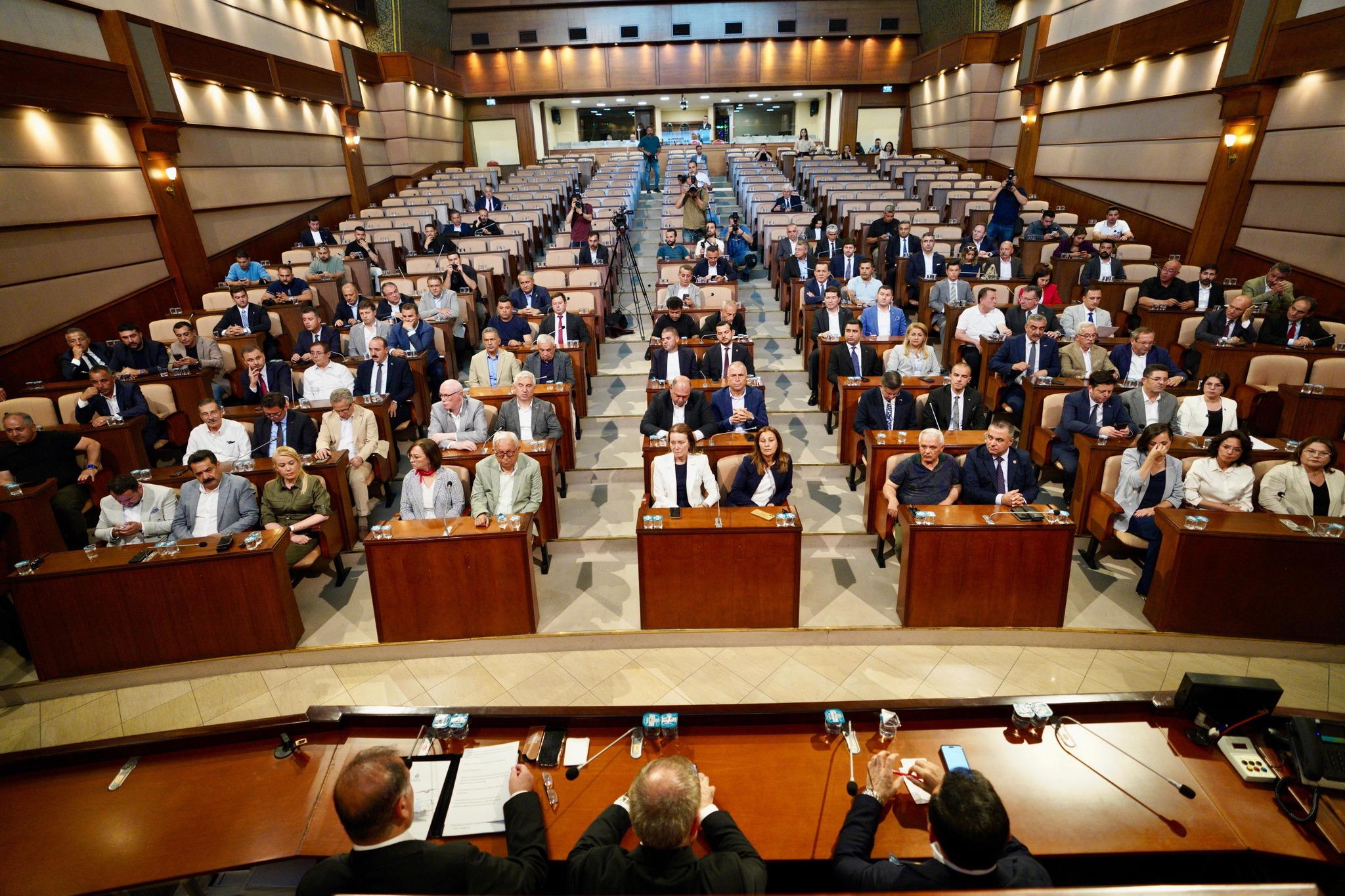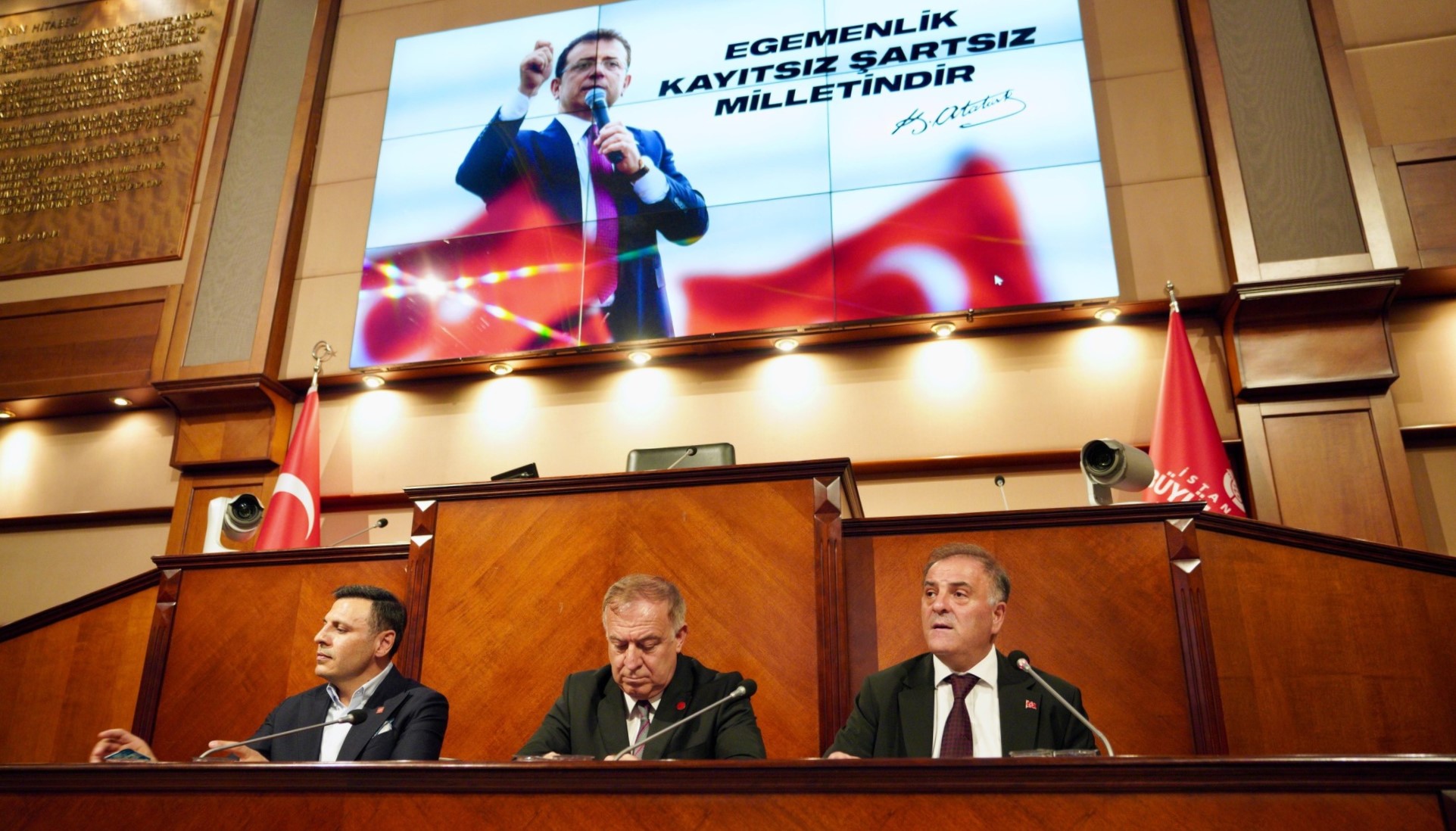 Cumhuriyet Halk Partisi’nin (CHP), nüfusu 100 binin üzerinde olan il ve ilçelerini yöneten belediye başkanları, İstanbul Büyükşehir Belediyesi (İBB) Meclis Salonu’nda düzenlenen “dayanışma toplantısında” bir araya geldi. 19 Mart sivil darbesiyle özgürlüğü elinden alınan CHP’nin cumhurbaşkanı adayı, seçilmiş İBB ve TBB Başkanı Ekrem İmamoğlu’nun katılımcı başkanlara yolladığı mesaj, Maltepe Belediye Başkanı Esin Köymen tarafından okundu. CHP Genel Başkan Yardımcısı Gökan Zeybek, CHP İstanbul İl Başkanı Özgür Çelik ve İBB Başkanvekili Nuri Aslan’ın katılımlarıyla gerçekleştirilen buluşma, yaşadığı talihsiz kaza sonucu hayatını yitiren Manisa Büyükşehir Belediye Başkanı Ferdi Zeyrek anısına saygı duruşunda bulunulması ve ardından İstiklal Marşı’nın okunmasıyla başladı. Bu sırada ekrana, Zeyrek’in fotoğrafının bulunduğu görsel yansıtıldı.