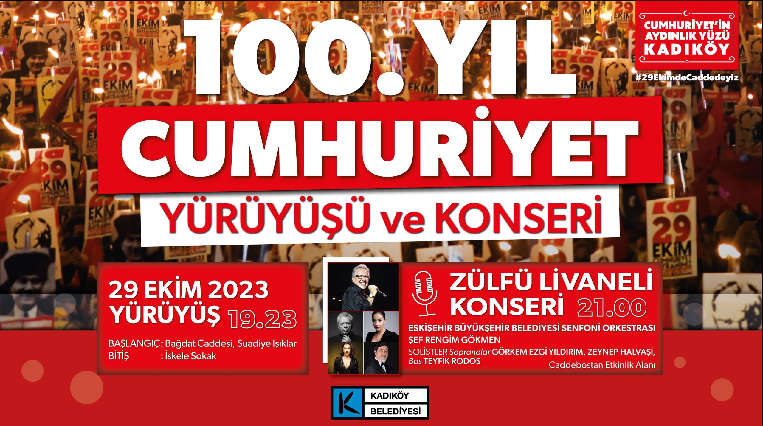 Birbirinden özel Cumhuriyet şarkıları ve marşları eşliğinde yapılacak yürüyüşün ardından 100. yıl coşkusu, Caddebostan Sahili’nde Zülfü Livaneli Konseri ile devam edecek. Usta sanatçı Zülfü Livaneli’ye solist olarak Zeynep Helvaşi, Teyfik Rodos ve Görkem Ezgi Yıldırım yanı sıra şef Rengim Gökmen yönetimindeki Eskişehir Belediyesi Senfoni Orkestrası da eşlik edecek. Büyük Cumhuriyet Yürüyüşü ve Zülfü Livaneli’nin 100. Yıl Konseri, Kadıköy Belediyesi tarafından çok sayıda kamera ve drone çekimleriyle canlı olarak sosyal medya platformlarından da yayınlanacak.