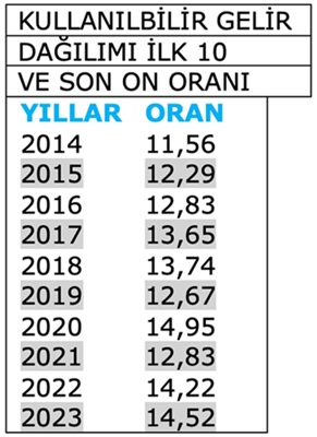 Türkiye’de 2014 yılında nüfusun en zengin yüzde onunun gelirden aldığı pay, nüfusun en fakir yüzde onunun 11,56 katı idi. Bu fark yıllar itibariyle arttı ve 2023 yılında 14,52 kata yükseldi. (Aşağıdaki tablo)