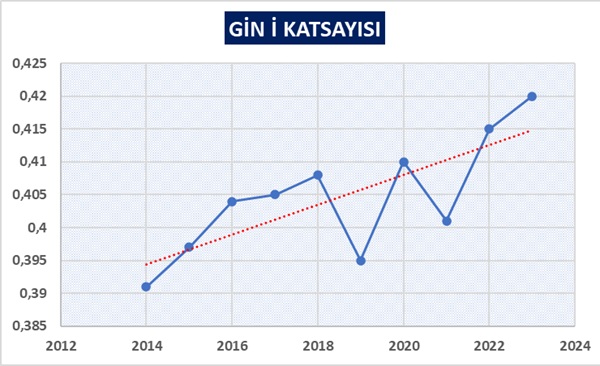 Sıfır ile bir arasında değişen Gini katsayısı, büyüdükçe gelir dağlımı bozuluyor demektir. TÜİK verilerine göre 2014 yılında 0,379 olan gini katsayısı, 2023 yılında 0,419 oldu. (Aşağıdaki grafik)