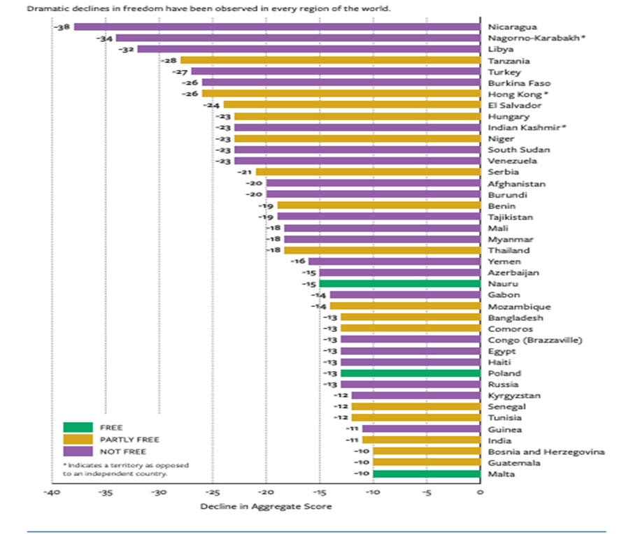 ‘’2005 yılında dünya nüfusunun yüzde 46’sı insan hakları ve siyasi özgürlükler açısından özgür statüde iken, 2021 yılında bu oran yüzde 20,3’ e geriledi.’’ Deniliyor.
